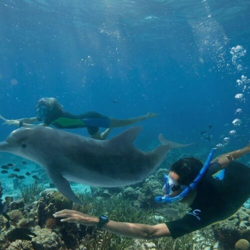 Schnorcheln und sehen die fröhlichen verspielten Delfine hautnah.